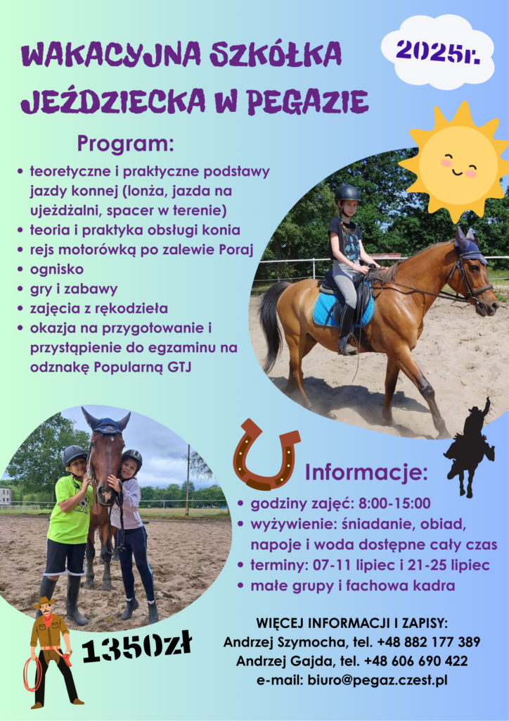Wakacyjna szkółka jeździecka 2024 w Pegazie Półkolonie w TKKF PEGAZ w Częstochowie Turnusy: